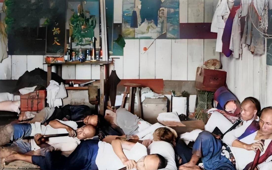 与义和团的亢奋形成鲜明对比的,是烟馆里那些萎靡不振的身影,另一张老照片中,六名男子挤在一间低矮潮湿的烟馆里,以地为床。