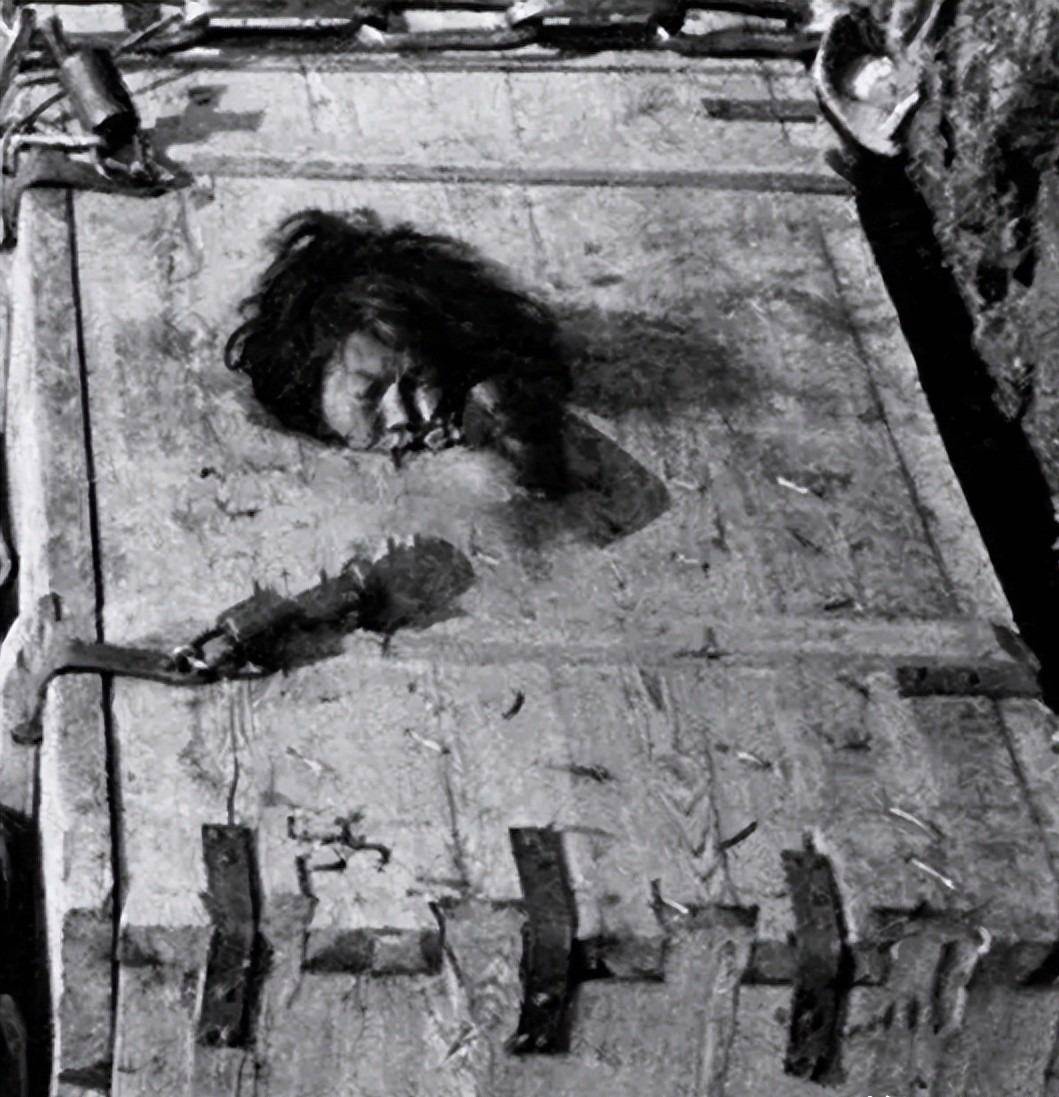 只在侧面留一个小孔供犯人呼吸,犯人坐在笼中,双脚被铁链锁在笼底的铁环上,胳膊被反绑在身后,脖子被一个特制的木枷卡住。