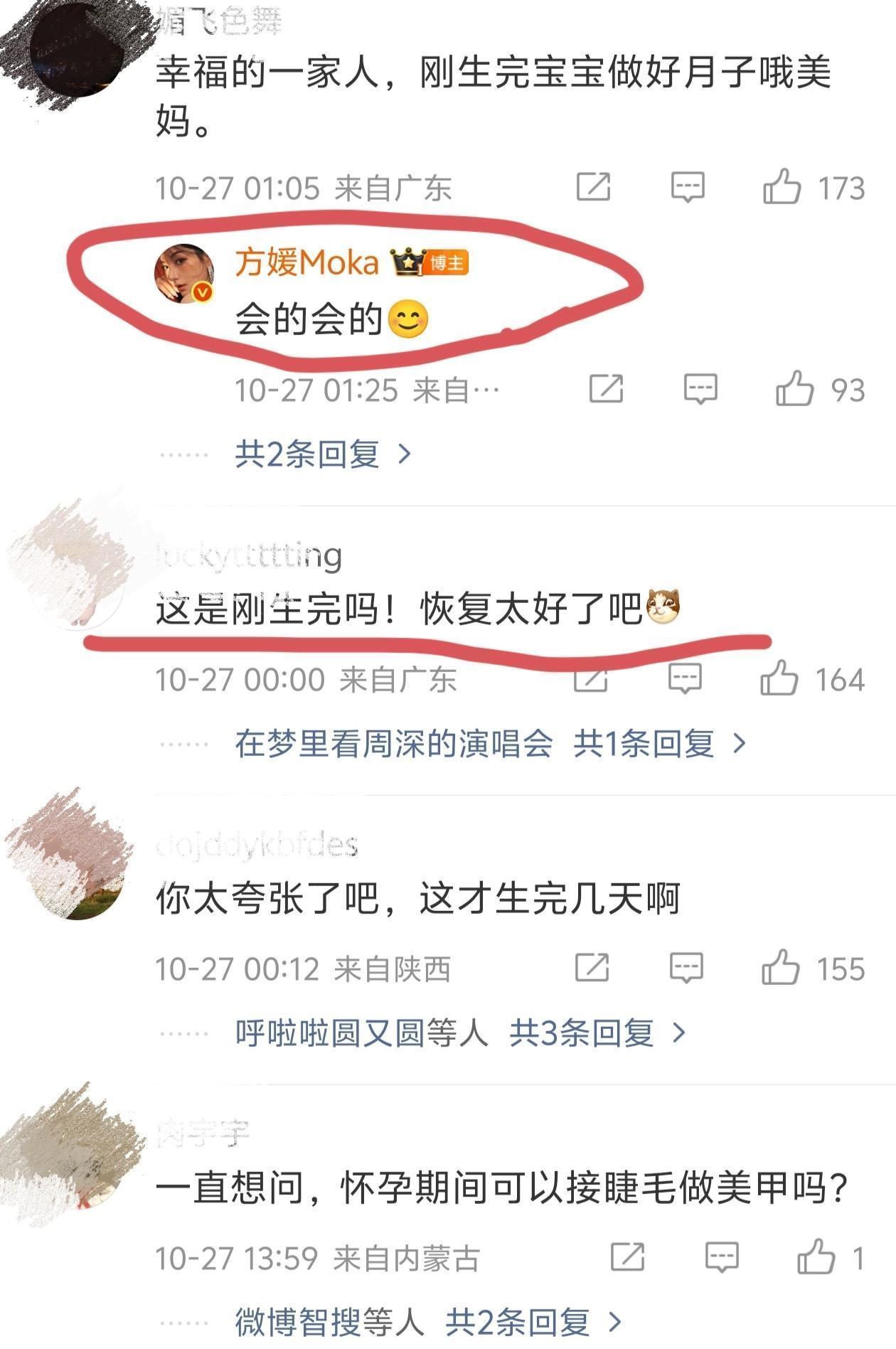 当然也有很多网友关心方媛的身体,纷纷留言:好好坐月子吧!她也收到了大家的关心,回复:回去就继续坐。其实对于艺人来说,可能无论是生活中一些大小事都会被放大,甚至恶意揣测。但是真正是否幸福,他们当事人更清楚。